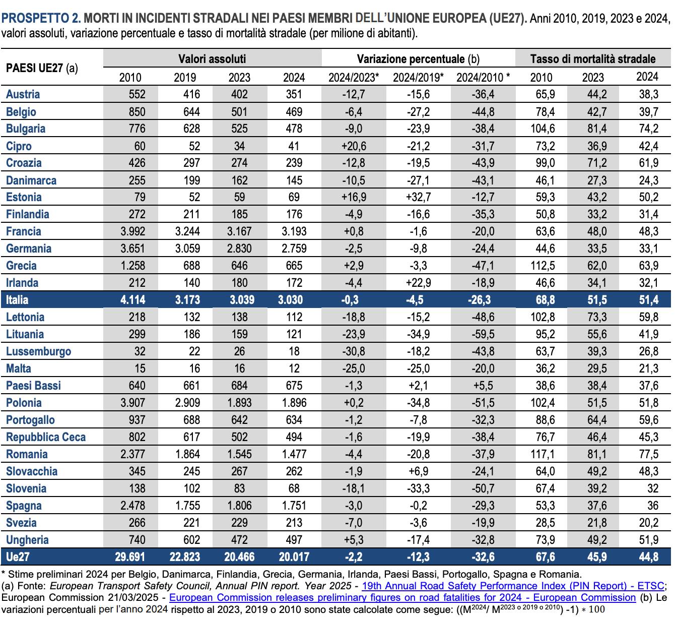 L'Umbria nel 2024 ha avuto 62 morti per incidenti stradali, è il dato più alto degli ultimi 9 anni ed è quasi il doppio rispetto al dato del 2016 che fu di 35. Questo dato corrisponde a un tasso di mortalità di 73 morti ogni milione di abitanti, il più alto tra le regioni italiane e se si confronta questo dato con il resto d'Europa siamo inferiori e di poco soltanto a Paesi come Romania e Bulgaria.
