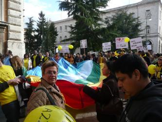 Lunedi 1 marzo: il corteo si forma in piazza Italia, e sfila per Corso Vannucci. Italiani e stranieri, oppure italiani e nuovi italiani, oppure cittadini e nuovi ciattadini... Si cerca di fare allegria, ma le facce sono serie, preoccupate. Non c'è da stare allegri, oggi, in Italia. Per tutti: vecchi e nuovi abitanti. Ecco alcune foto: