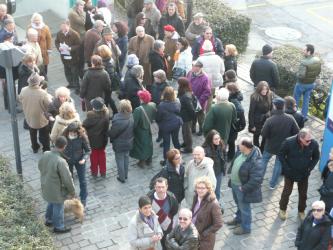 La bella giornata, la prima dopo tanto inverno, ha invogliato un bel gruppo di persone a interrogare la città per scoprirne le sue risorse più intime, come l'acqua che si raccoglie sotto le sue case e i suoi orti e scaturisce alla base dell'acropoli. Siamo partiti dal vialetto della scala mobile di via Pellini, dove abbiamo ricordato la prima piscina realizzata a Perugia, all'inizio degli anni Sessanta, e che fece provare a tanti giovani perugini il piacere di nuotare.