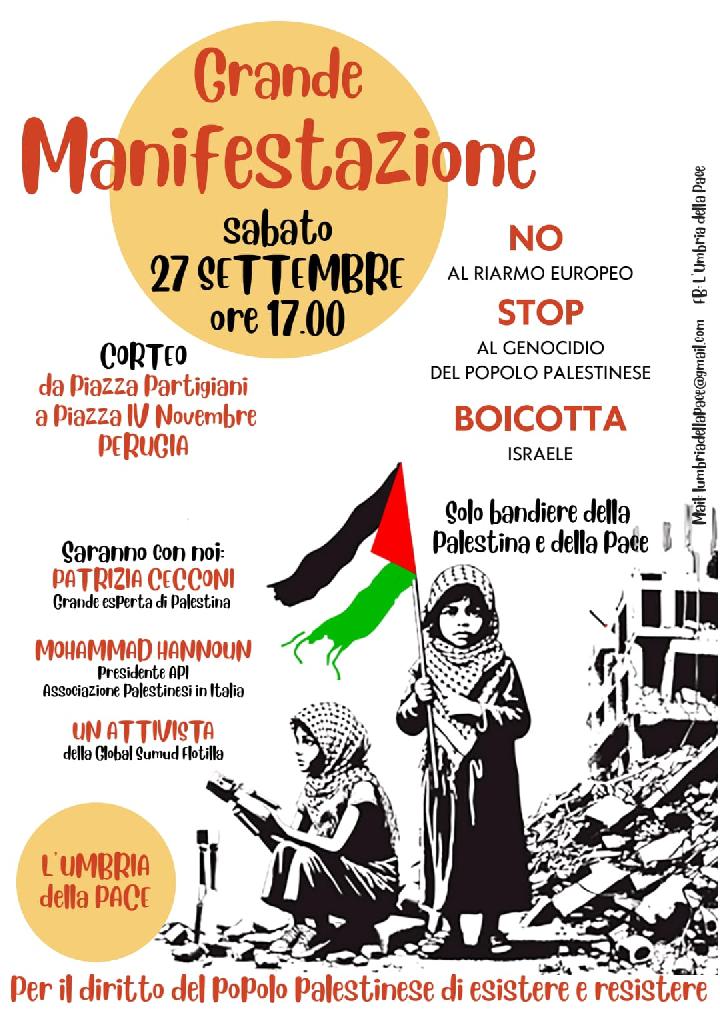 |  In piazza a Perugia per GazaSabato 27 settembre, alle ore 17.00, manifestazione con corteo a partire da Piazza Partigiani. Non possiamo permettere tutto questo: Né il genocidio in corso, né gli affari dopo Umbria per la pace